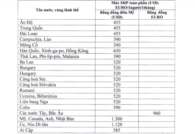 Với sinh hoạt phí, người học được cấp theo thời gian học tập thực tế, thanh toán định kỳ theo quý hoặc 6 tháng một lần. Mức chi trả sinh hoạt phí một tháng tùy thuộc vào từng quốc gia, khu vực, cụ thể: