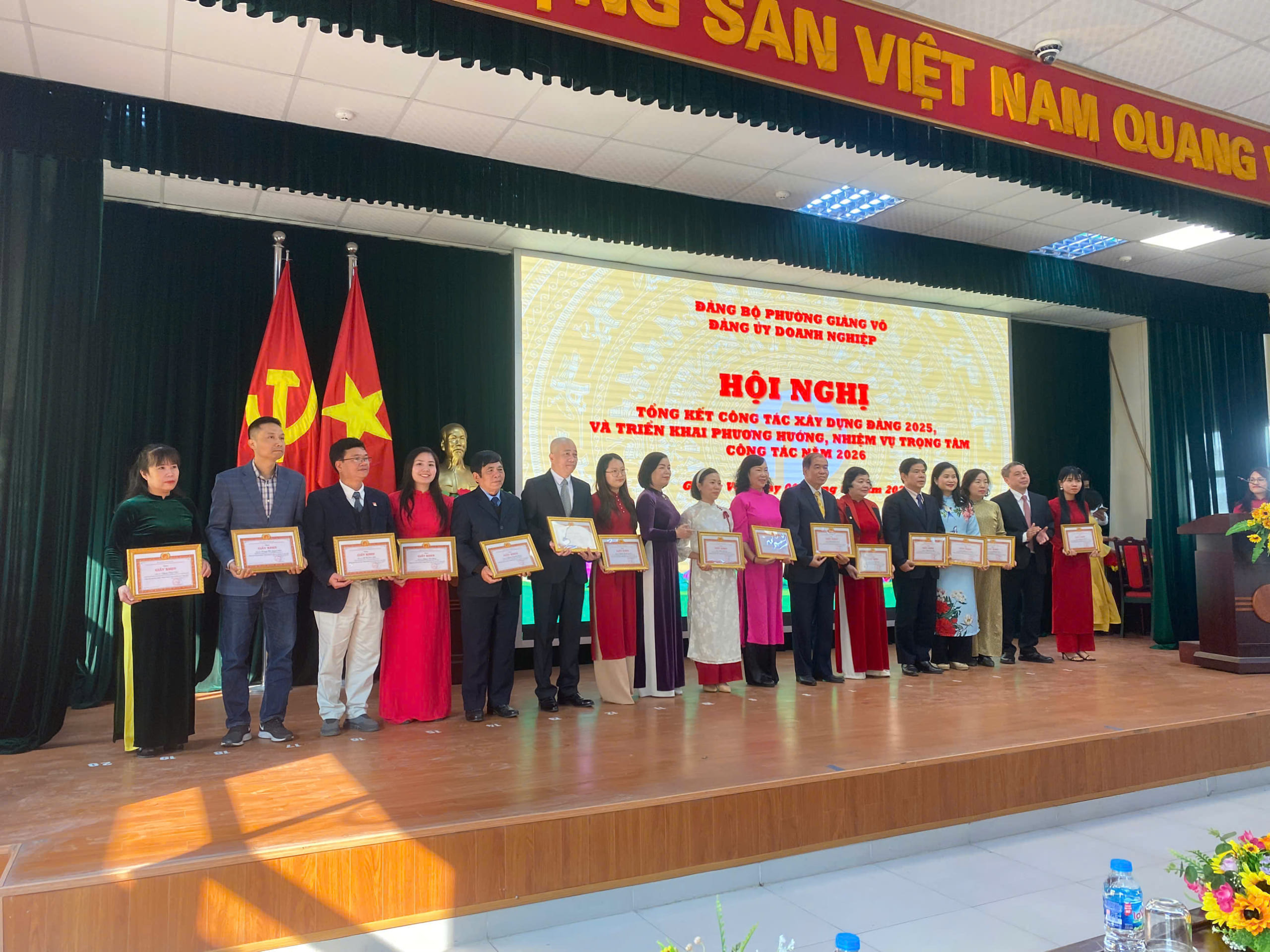 Trong khuôn khổ Hội nghị, Ban Thường vụ Đảng uỷ Phường Giảng võ đã tổ chức khen thưởng các tập thể có thành tích tiêu biểu trong năm 2025. Cụ thể, 11 tổ chức đảng được tặng Giấy khen do đạt thành tích “Hoàn thành xuất sắc nhiệm vụ” tiêu biểu năm 2025; 11 tổ chức đảng có thành tích xuất sắc trong công tác lãnh đạo, chỉ đạo và tổ chức Đại hội đảng bộ cấp nhiệm kỳ 2025-2030; cùng 7 tổ chức đảng có thành tích xuất sắc trong tổ chức Cuộc thi Chính luận bảo vệ nền tảng tư tưởng của Đảng năm 2025.